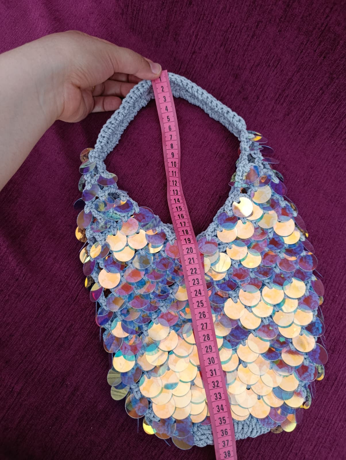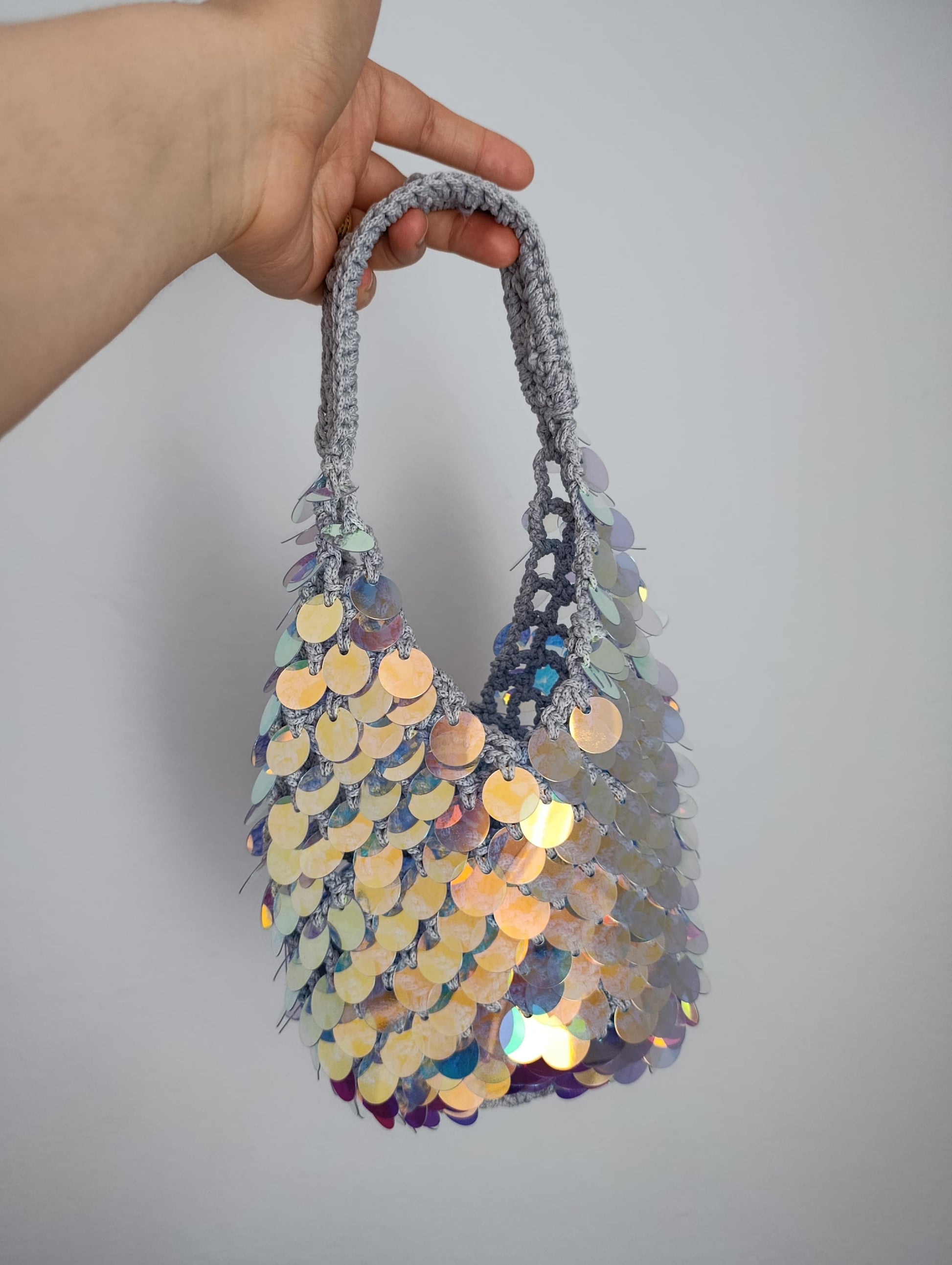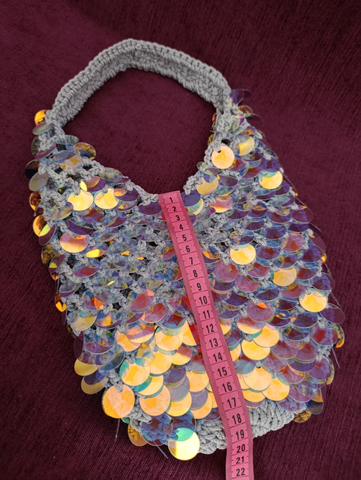 Shimmer & Stitch Crochet Bag with Iridescent Sequins. Add a touch of sparkle to your everyday look with this handcrafted crochet bag, beautifully adorned with round iridescent sequins. Each stitch is carefully crafted to create a soft, textured base that contrasts perfectly with the glimmering overlay. The sequins catch the light with every movement, shifting color and shine for a dreamy, eye-catching effect.