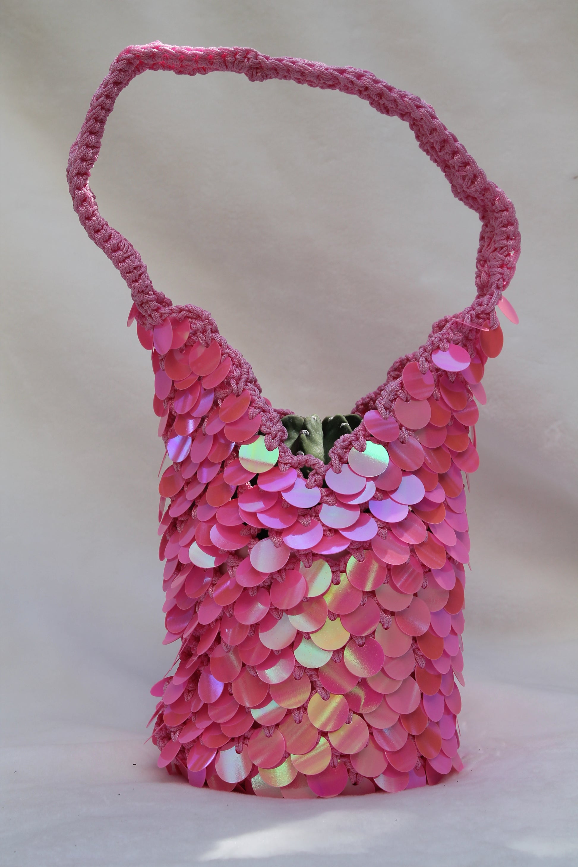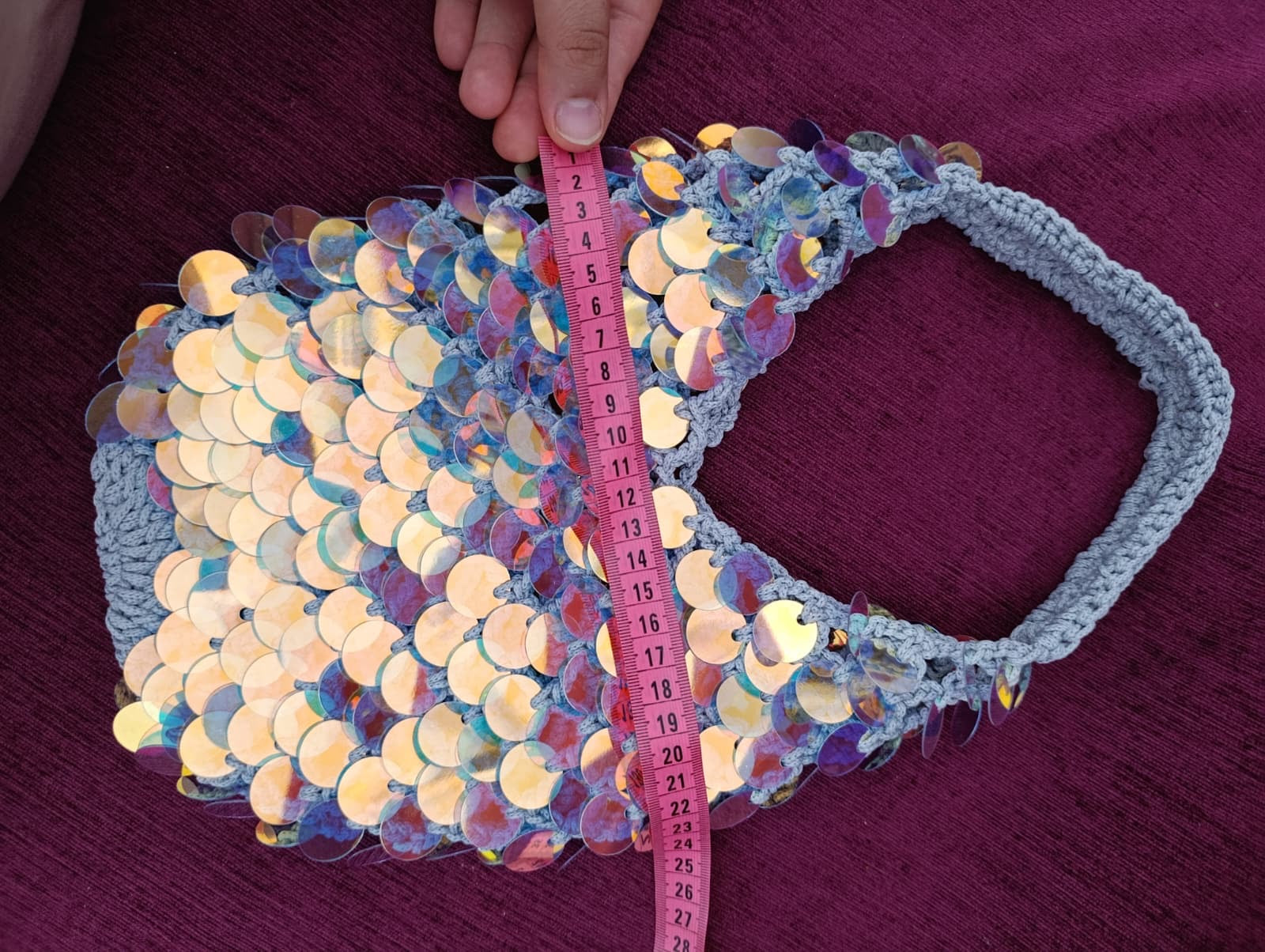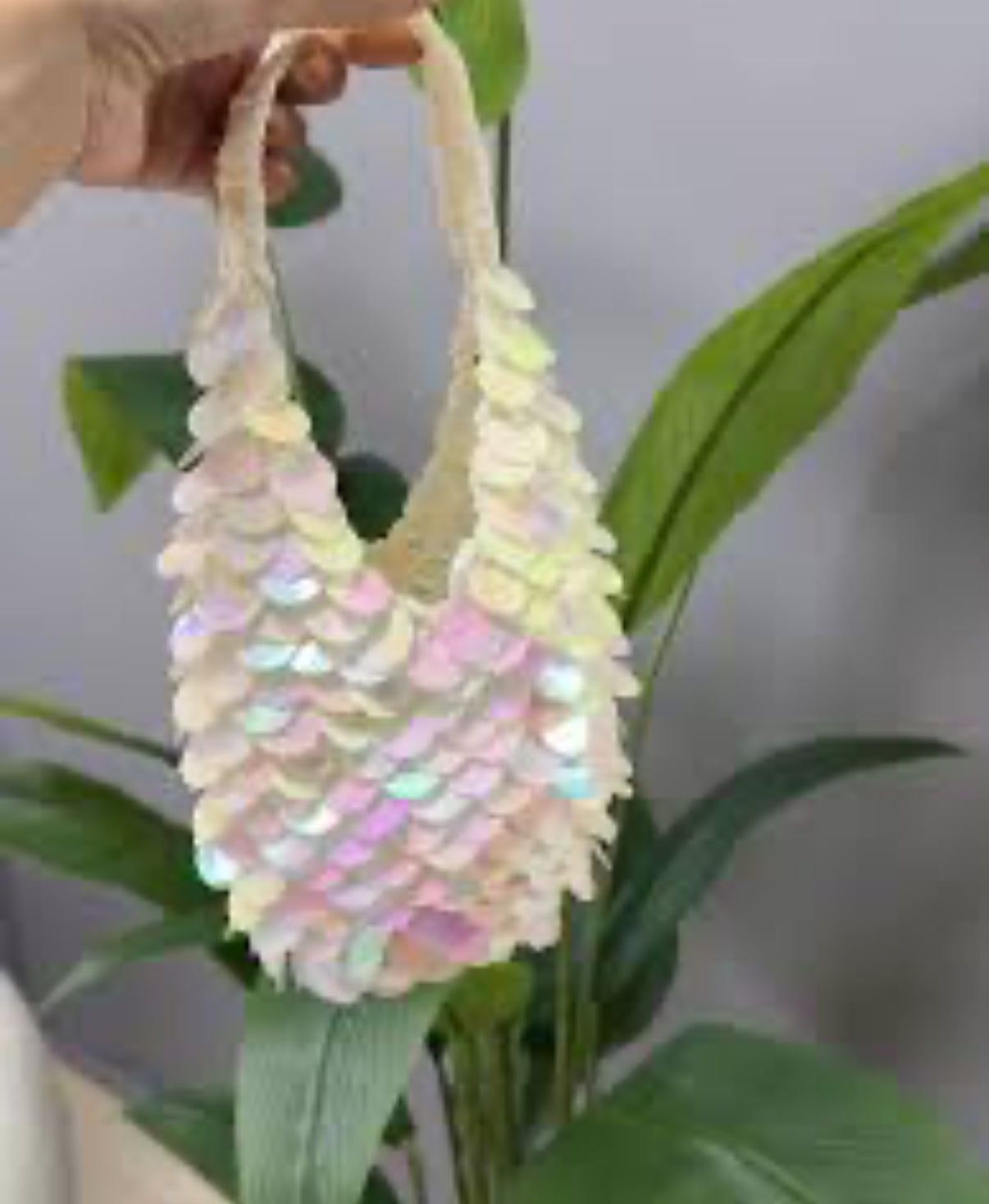 Shimmer & Stitch Crochet Bag with Iridescent Sequins. Add a touch of sparkle to your everyday look with this handcrafted crochet bag, beautifully adorned with round iridescent sequins. Each stitch is carefully crafted to create a soft, textured base that contrasts perfectly with the glimmering overlay. The sequins catch the light with every movement, shifting color and shine for a dreamy, eye-catching effect.