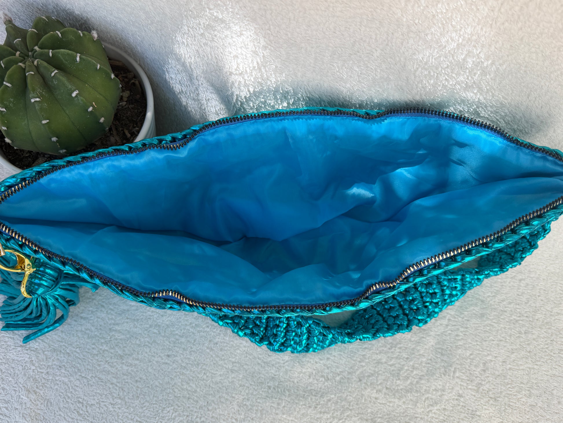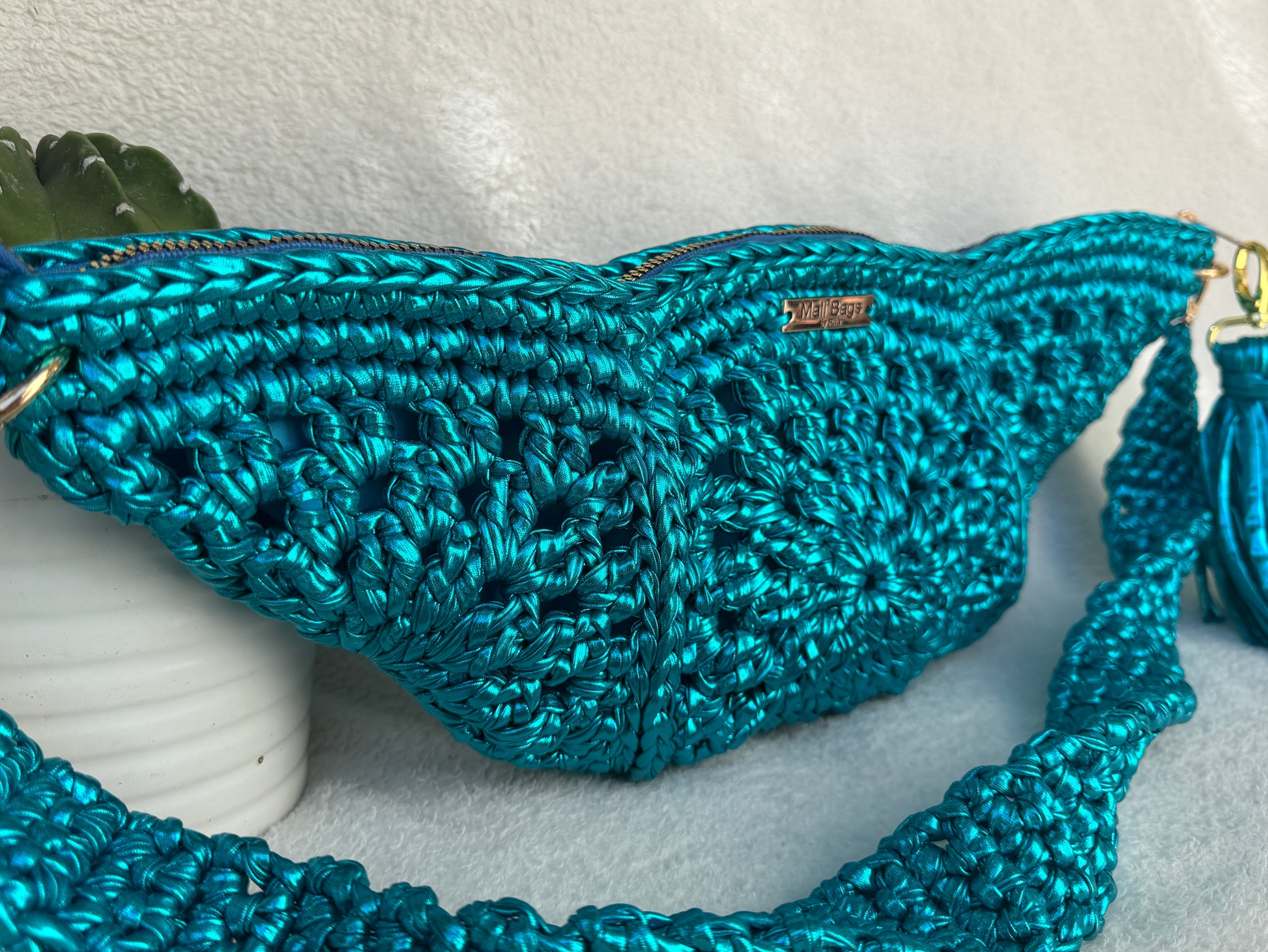 This half moon made in granny square is Like a bumbag but shoulder, all made with premium yarn, comes with lining inside a tassel and zipper to have all Your belongings safe.