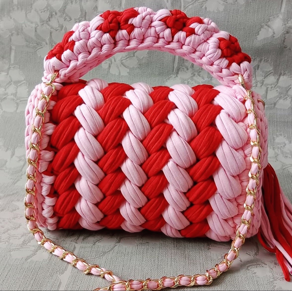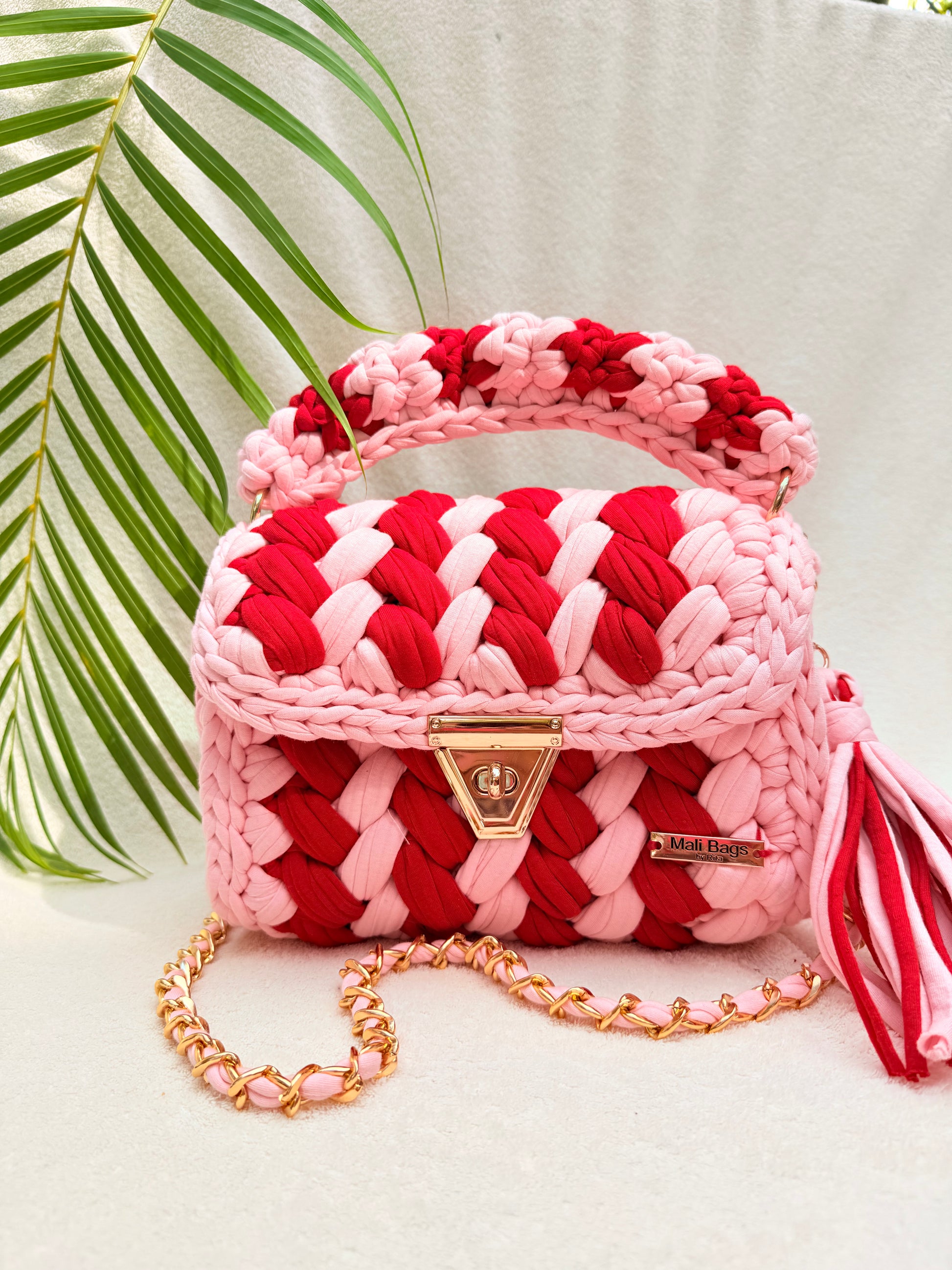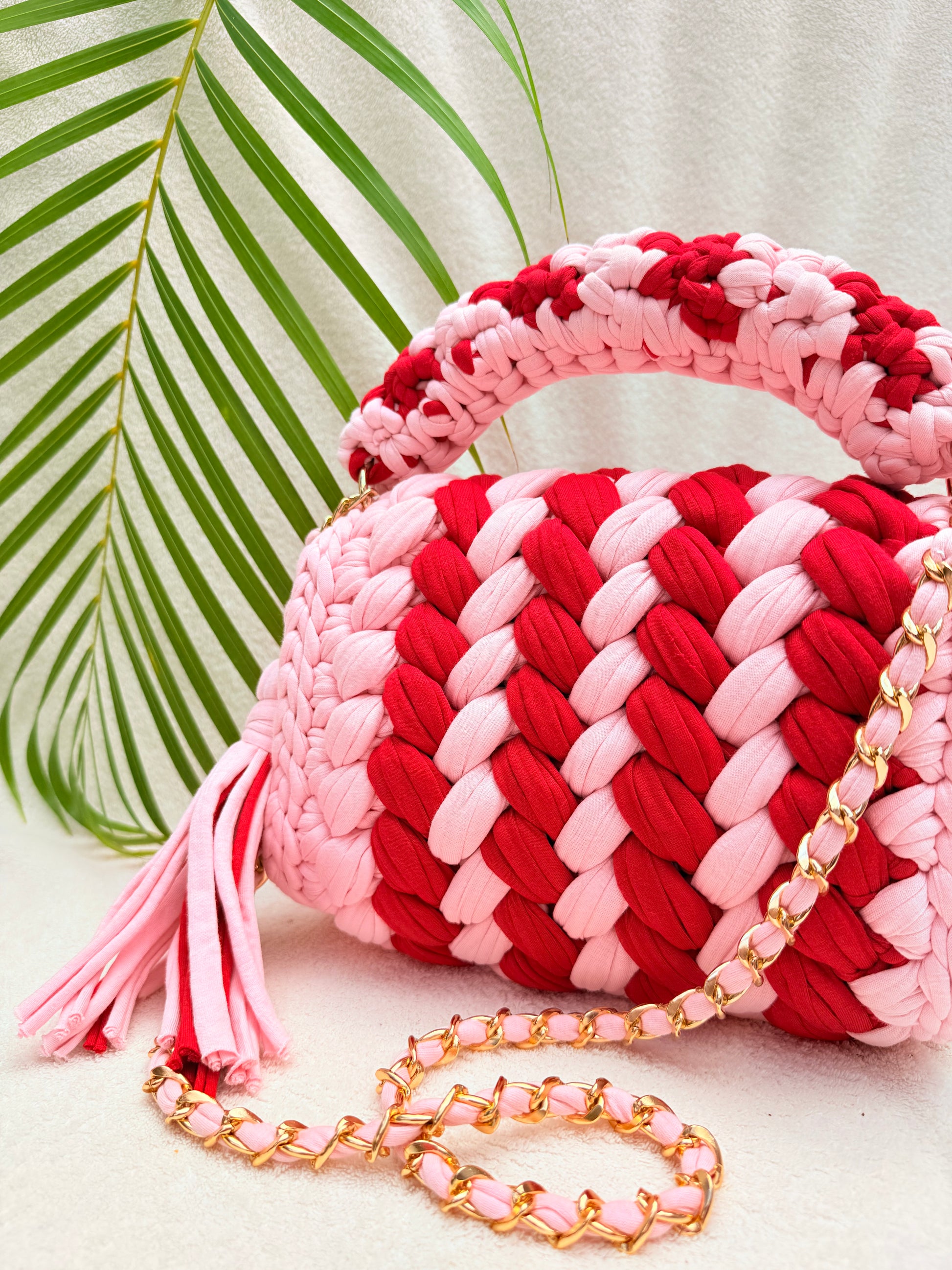 The vertical red and pink fashion handmade crochet puff bag is a delightful blend of vibrant colours and whimsical design. This unique accessory boasts a striking color combination of bold red and soft pink, creating a visually captivating palette that is sure to make a statement wherever you go.