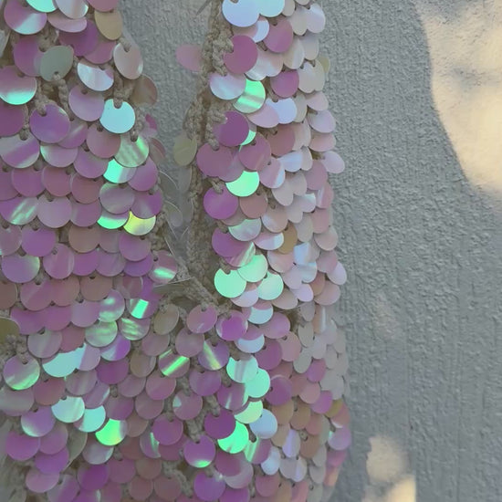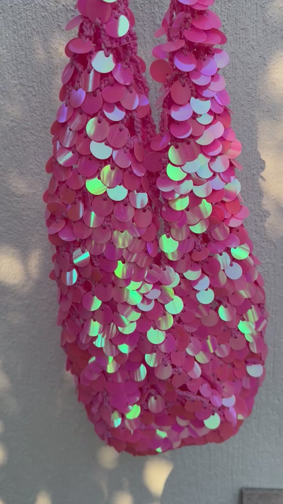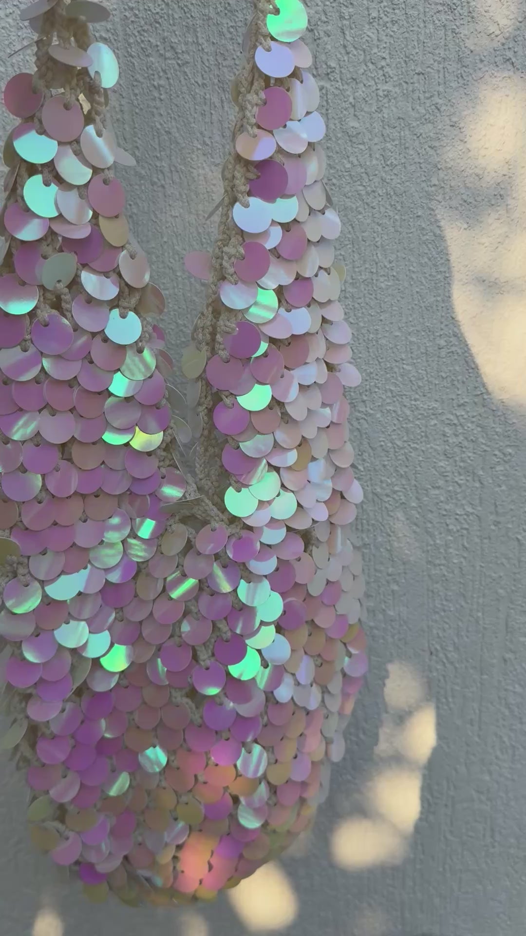 Shimmer & Stitch Crochet Bag with Iridescent Sequins. Add a touch of sparkle to your everyday look with this handcrafted crochet bag, beautifully adorned with round iridescent sequins. Each stitch is carefully crafted to create a soft, textured base that contrasts perfectly with the glimmering overlay. The sequins catch the light with every movement, shifting color and shine for a dreamy, eye-catching effect.