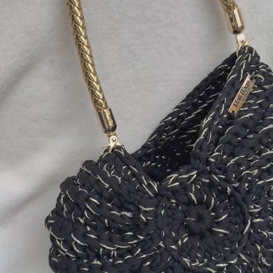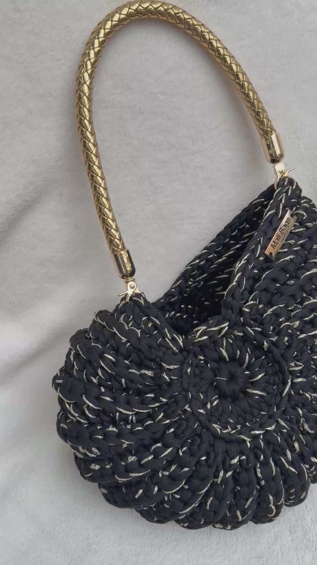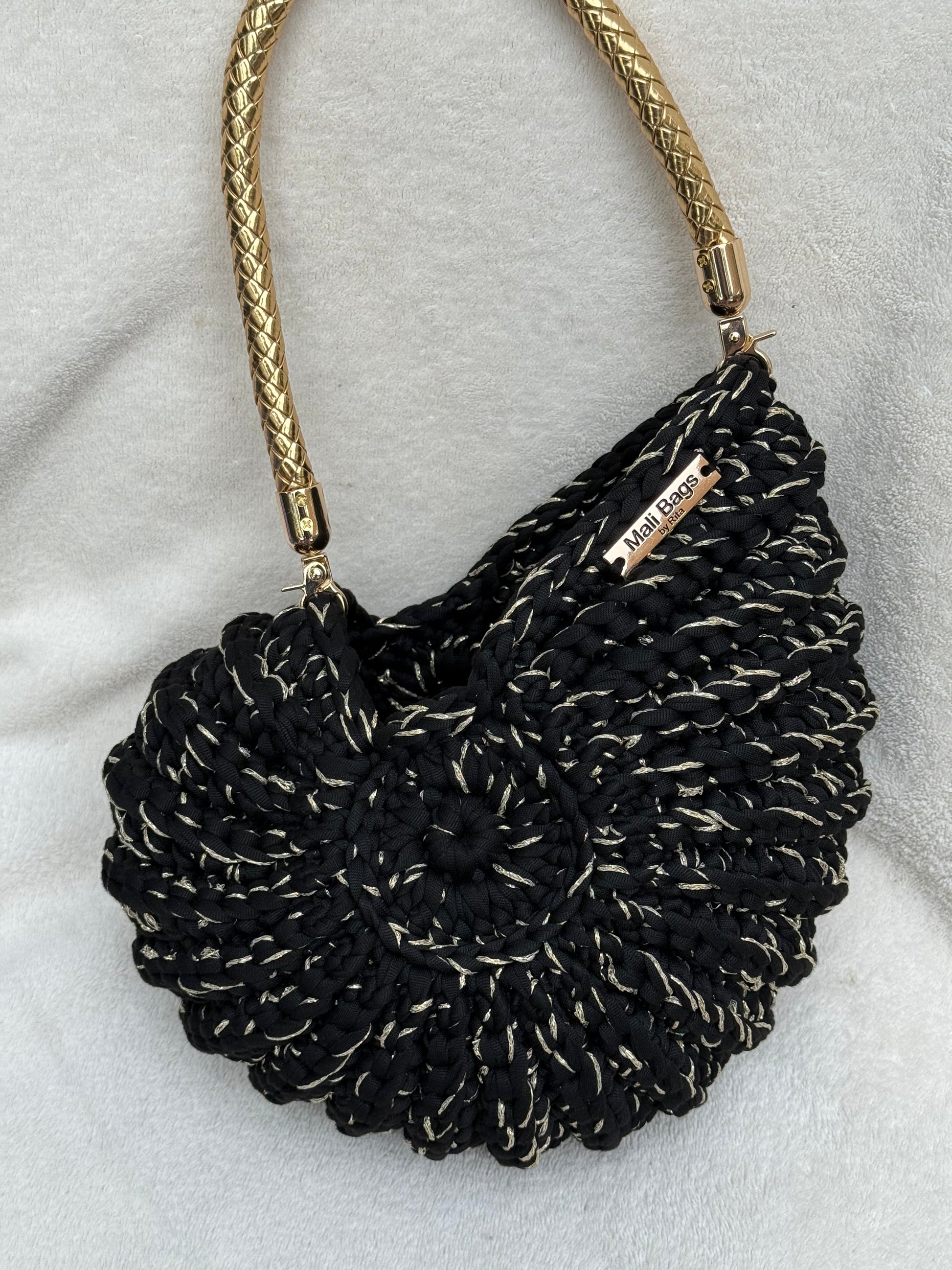 This round shell model is thread with a colour of your choice and a beautiful gold thin and shinny Gold yarn which makes this beautiful, chic and classic style.