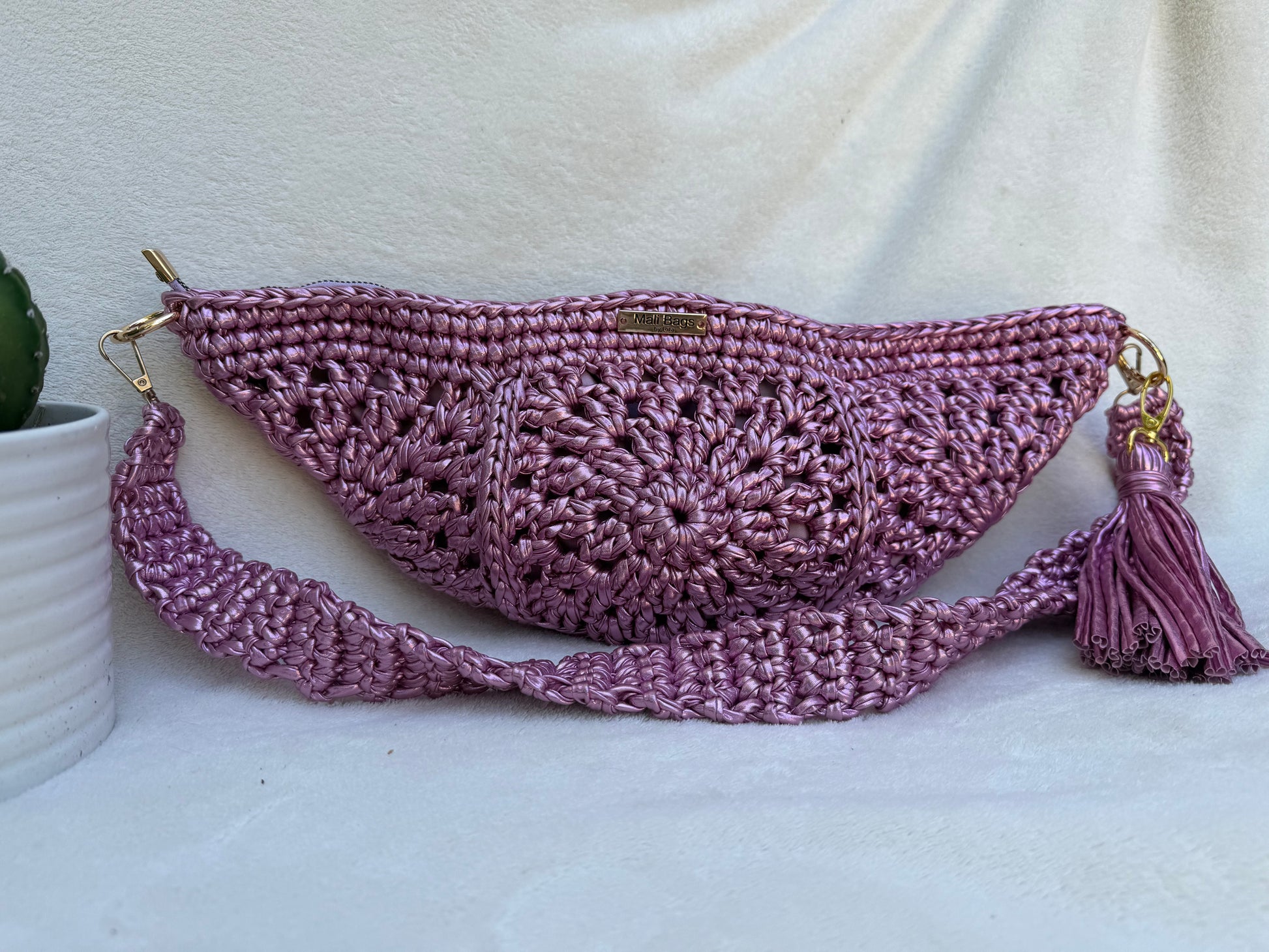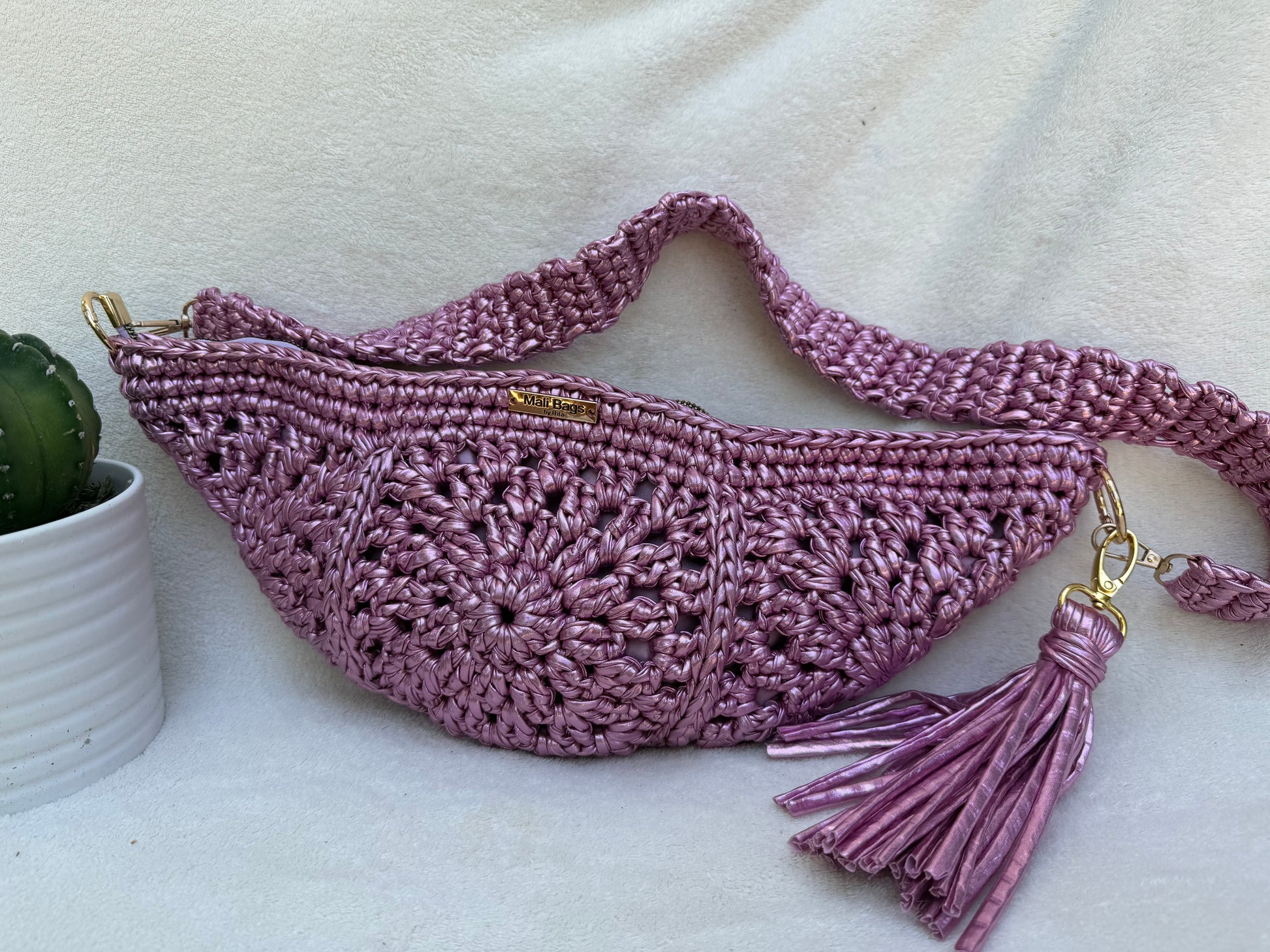 This half moon made in granny square is Like a bumbag but shoulder, all made with premium yarn, lining inside and zipper to have all Your belongings safe.