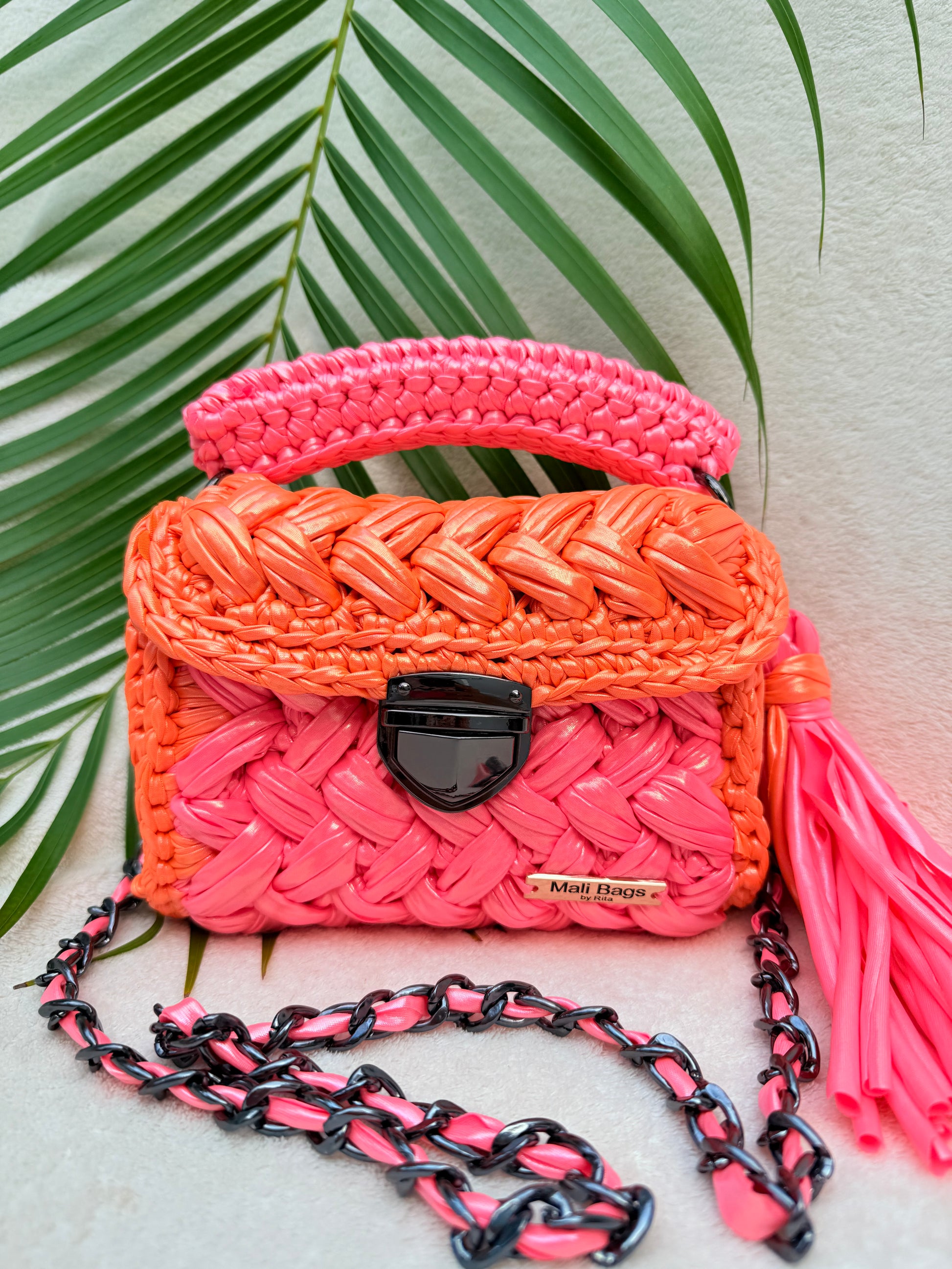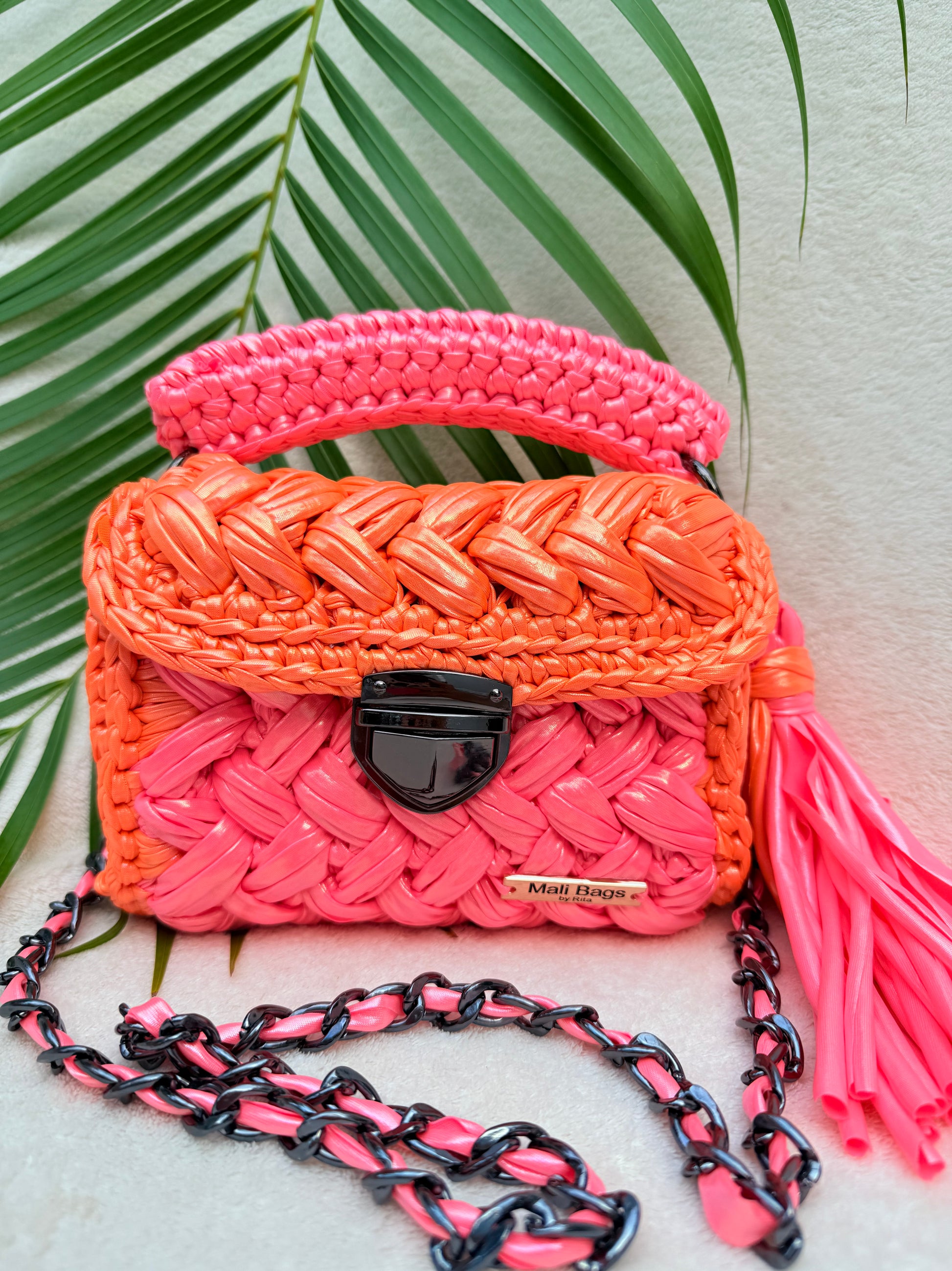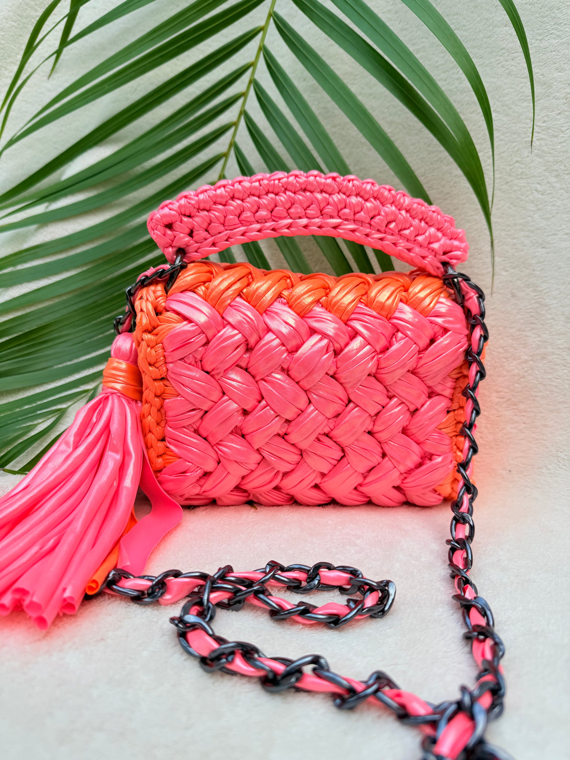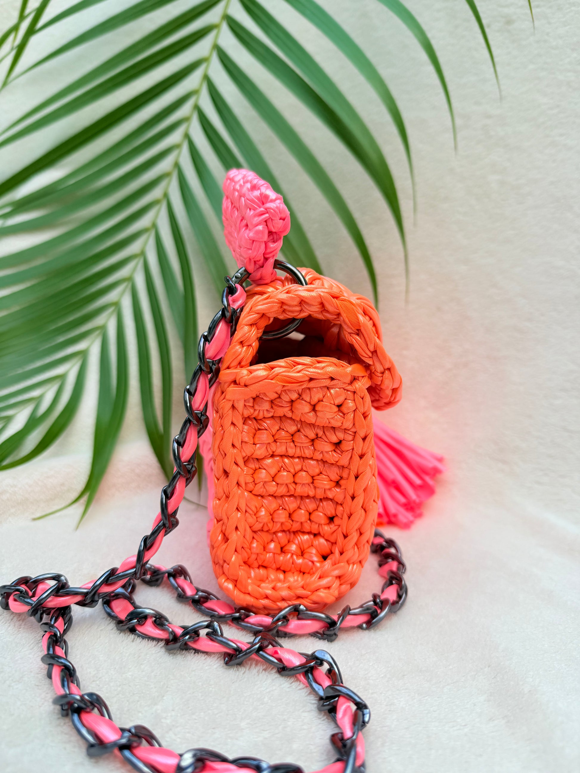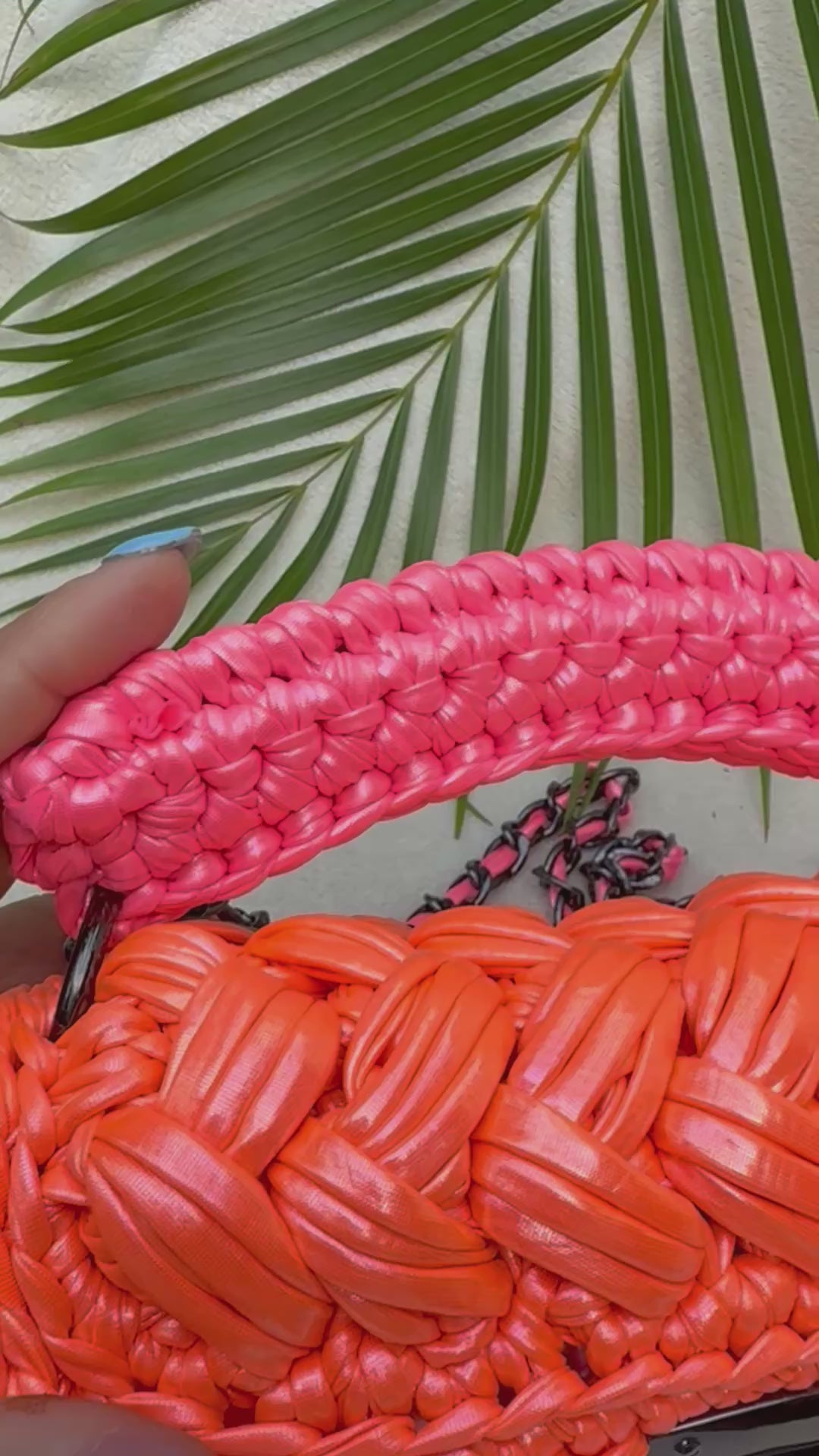 The high-quality leather ensures durability and longevity, while the vibrant neon color adds a modern and edgy touch to the classic crochet design. Whether you're hitting the town for a night out or adding a touch of excitement to your everyday wardrobe, this neon leather puffs crochet handbag is the ultimate fashion-forward accessory. Elevate your style and make a statement with this must-have handbag that is as chic as it is bold.