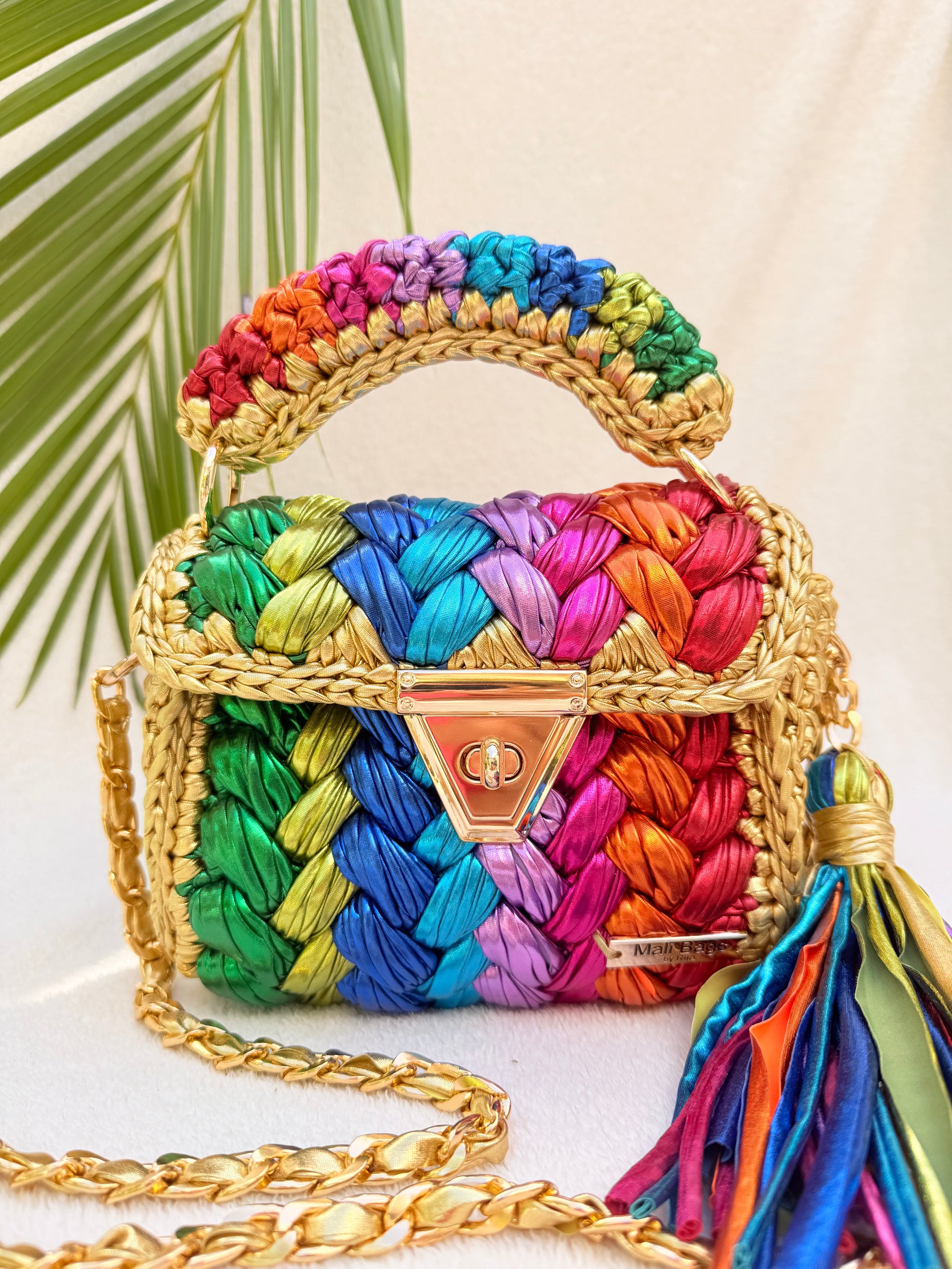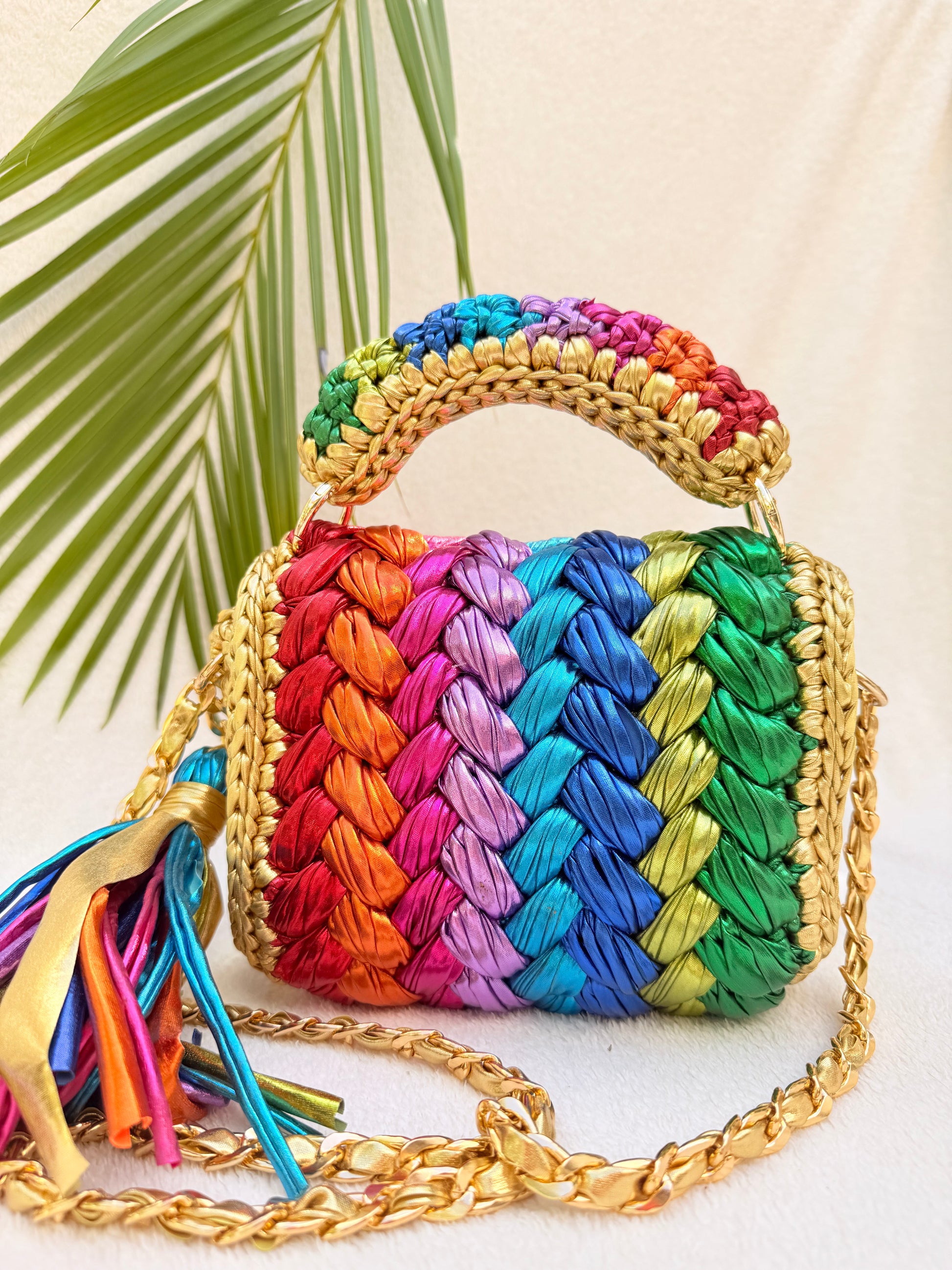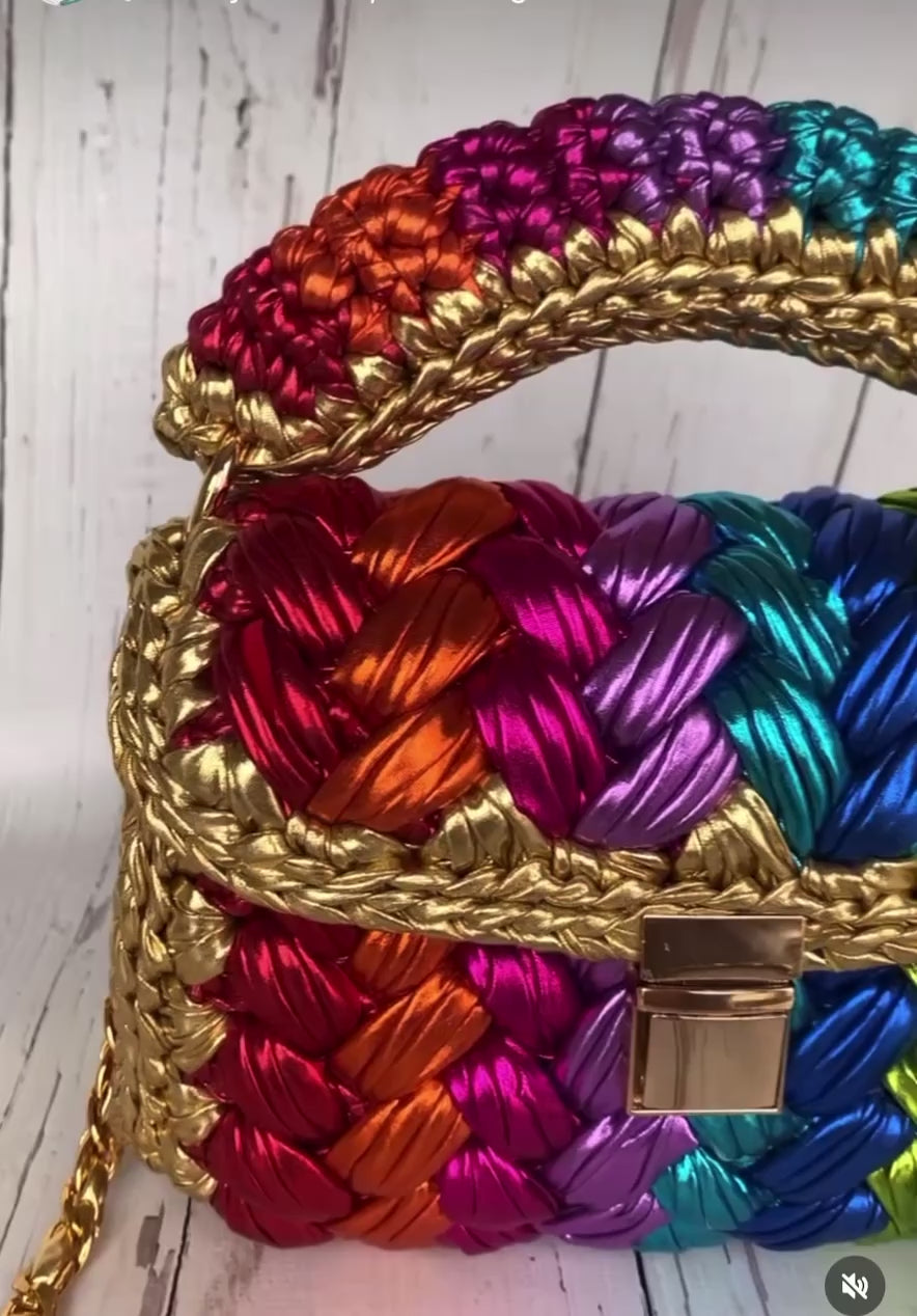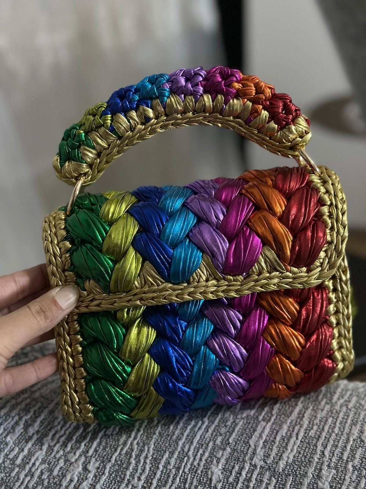The high-quality of metallic yarn ensures durability and longevity, while the vibrant metallic colours adds a modern and edgy touch to the classic crochet design. Whether you're hitting the town for a night out or adding a touch of excitement to your everyday wardrobe, this rainbow metallic puffs handbag is the ultimate fashion-forward accessory. Elevate your style and make a statement with this must-have handbag that is as chic as it is bold.