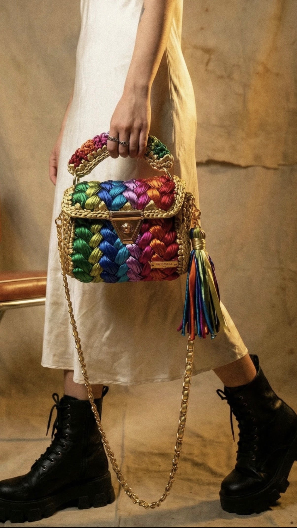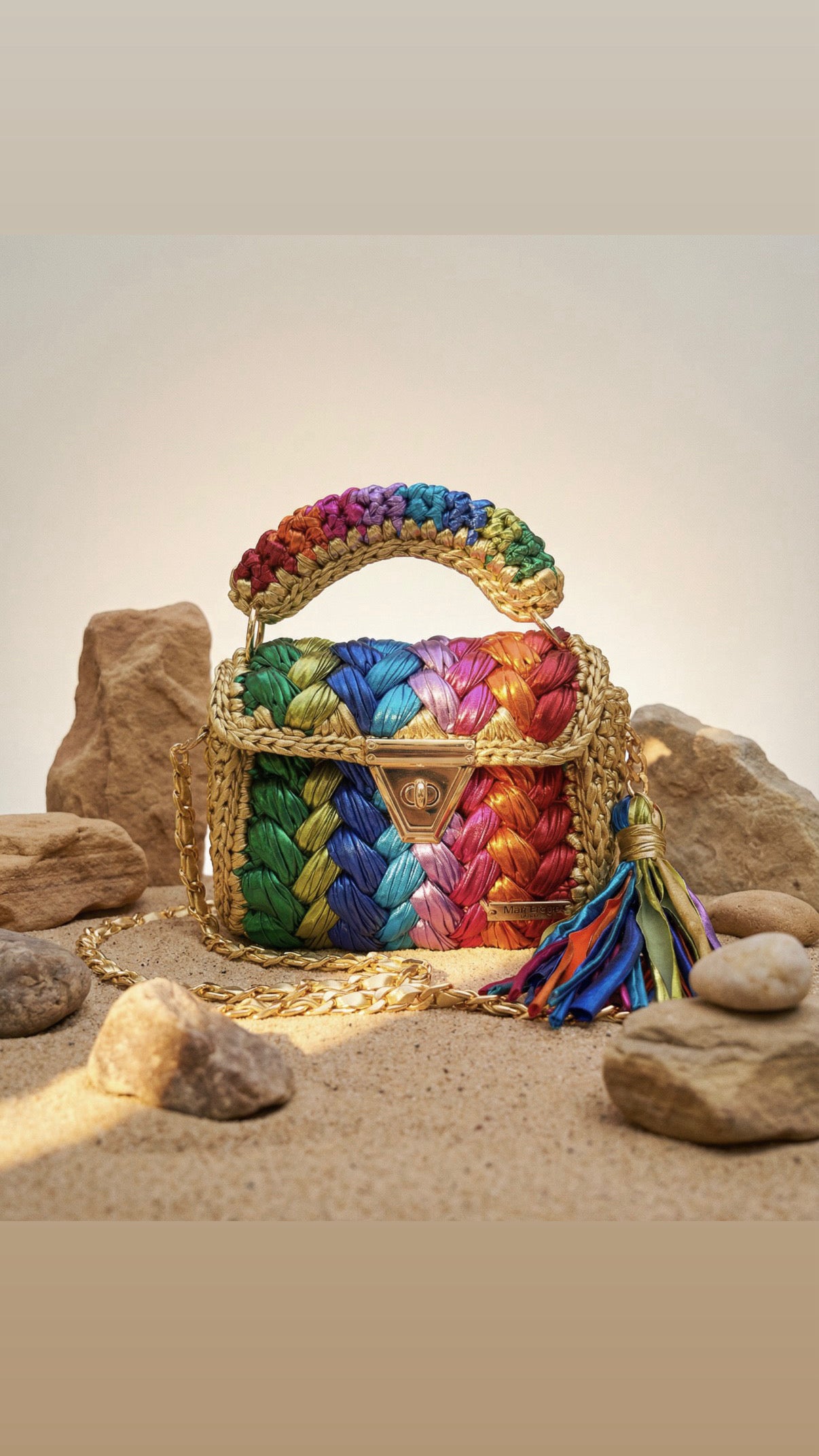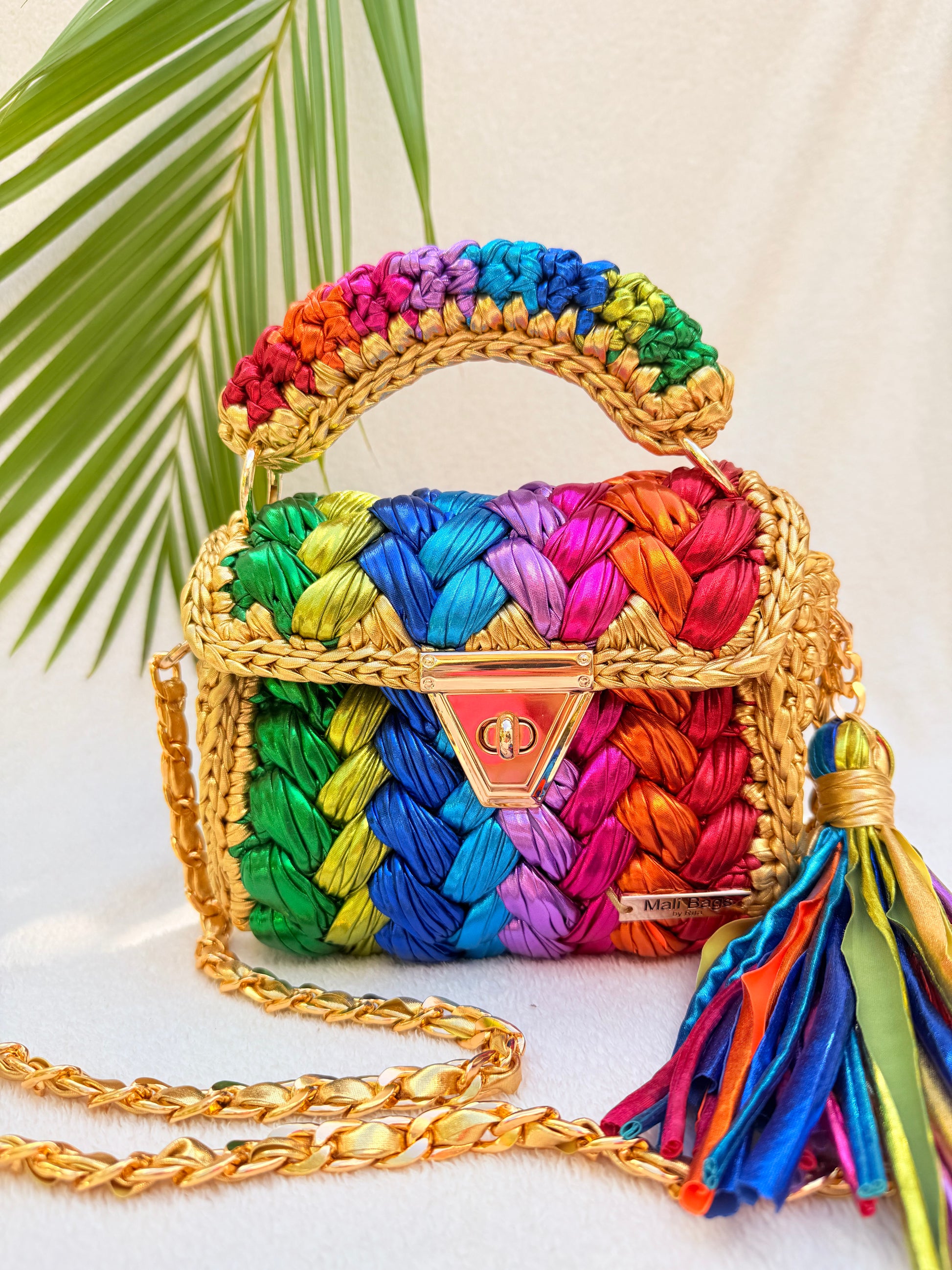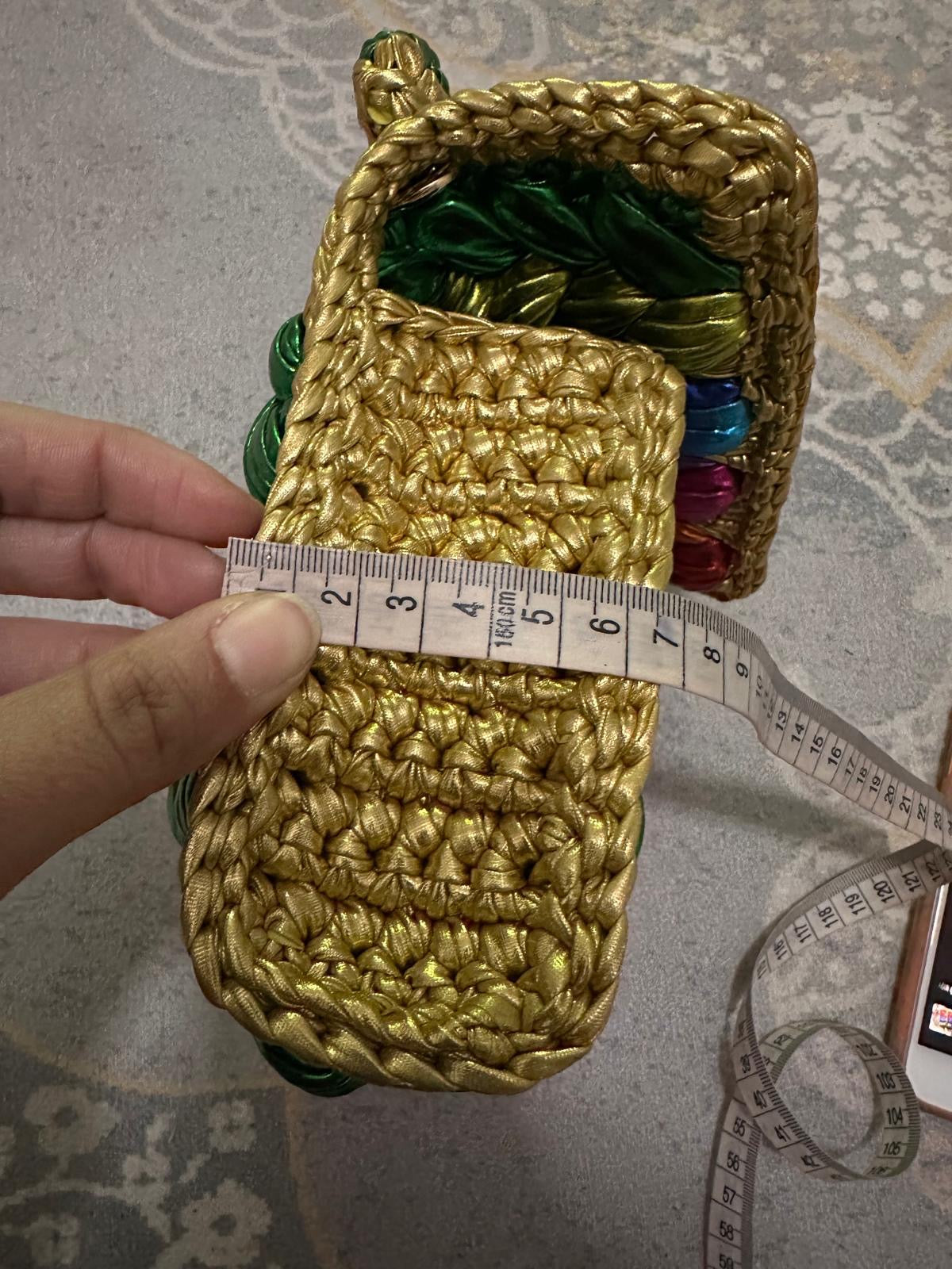 The high-quality of metallic yarn ensures durability and longevity, while the vibrant metallic colours adds a modern and edgy touch to the classic crochet design. Whether you're hitting the town for a night out or adding a touch of excitement to your everyday wardrobe, this rainbow metallic puffs handbag is the ultimate fashion-forward accessory. Elevate your style and make a statement with this must-have handbag that is as chic as it is bold.
